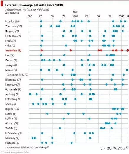 同样是1982年,阿根廷停止支付外债,而1989年则发生内部债务违约。国家用10年的时间,通过发行以美元计价的布雷迪债券进行债务重组,最终获得债务减免摆脱违约。
